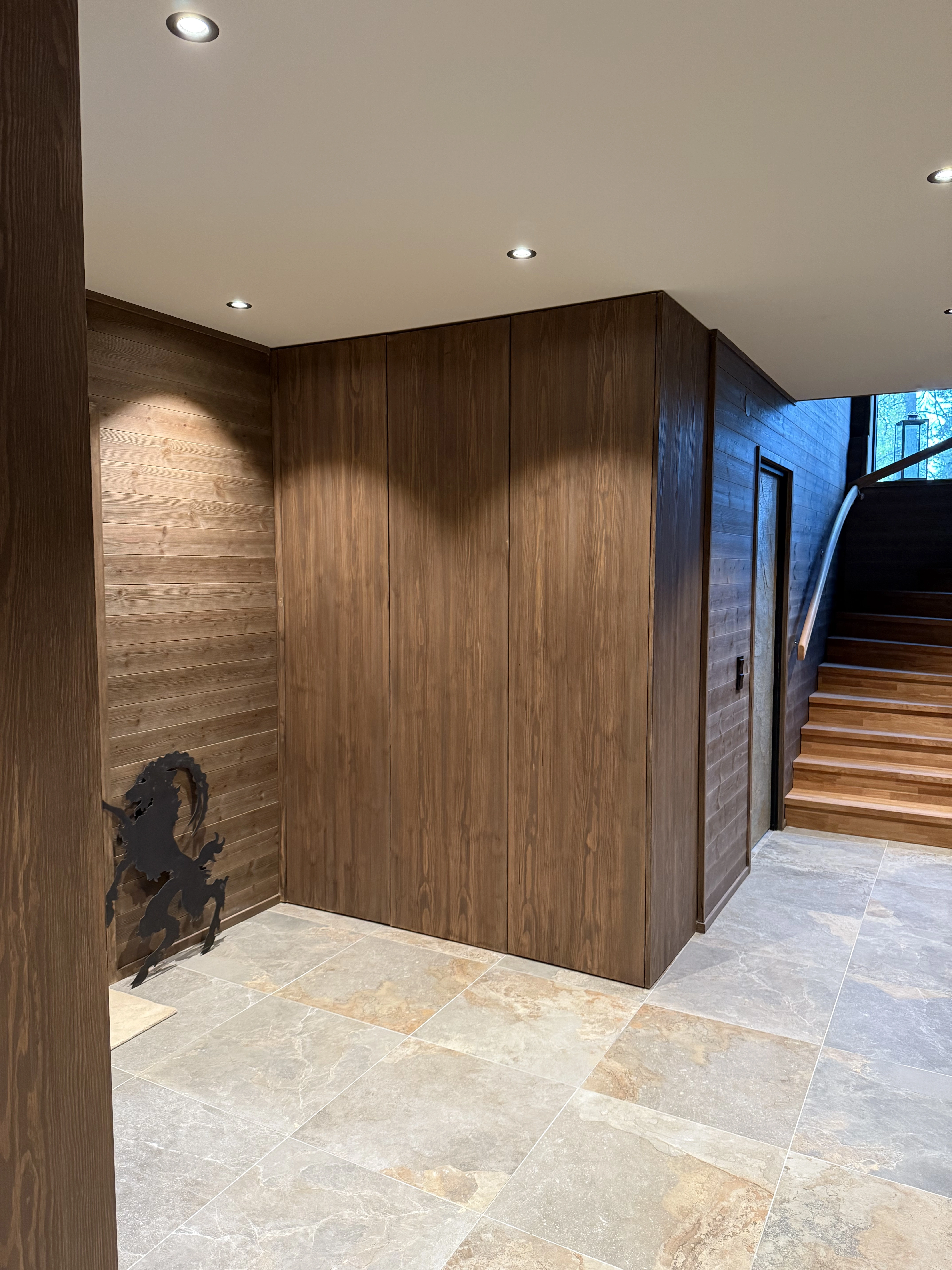 Golvhöga luckor i mörk furufaner — byggda exakt efter rummets mått. Det är den här typen av jobb som gör skillnaden mellan ett snyggt hem och ett riktigt genomtänkt hem.