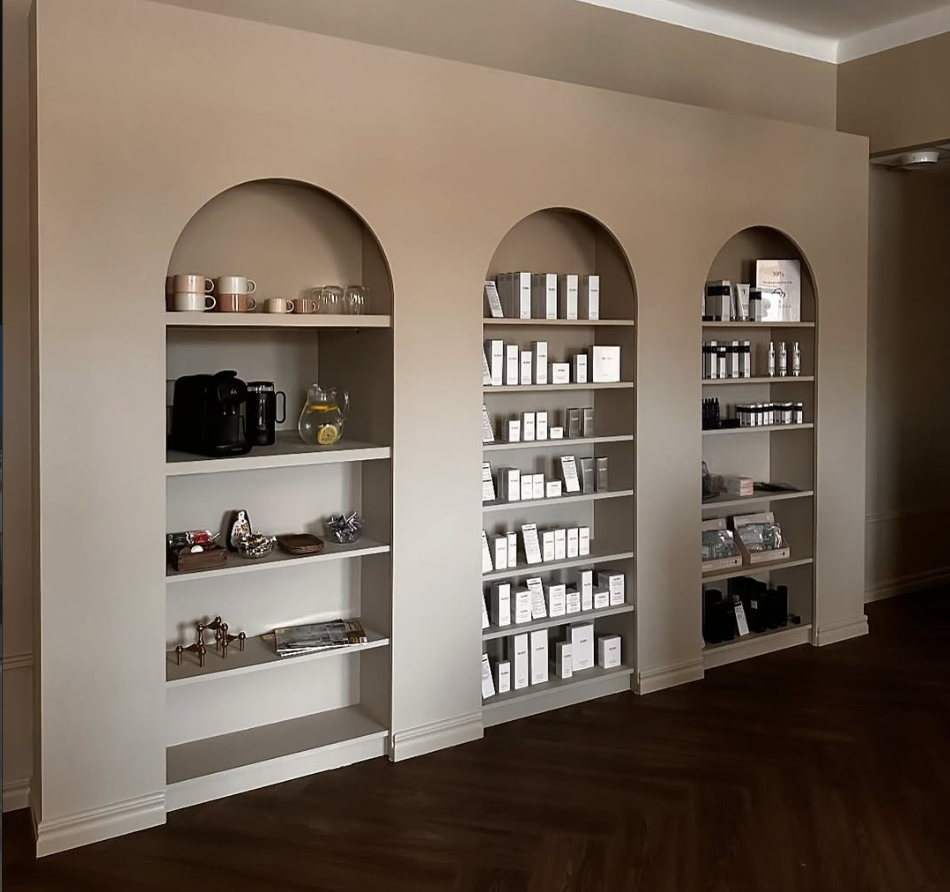 - Valvade nischer: Inbyggda hyllor med rundade ovankanter och integrerad belysning som lyfter fram produkterna.
