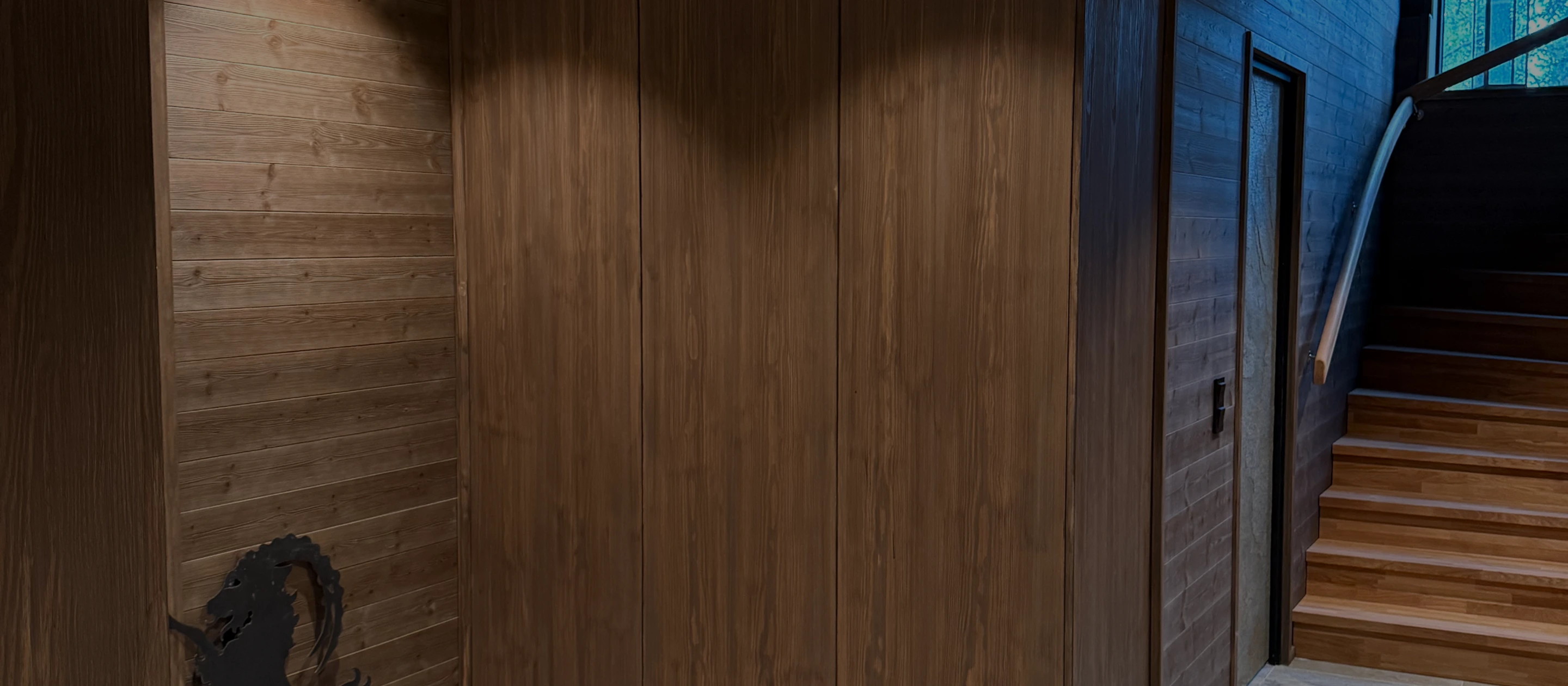 Därefter var det dags för installation. Med millimeterprecision passade vi in golv-till-tak-garderobena, klädda med luckor i en vacker och ljust betsad furufanér. Luckornas vertikala träådring möter på ett elegant sätt de mörka, liggande panelväggarna och stengolvet, och skapar en spännande kontrast av material och struktur. Inga täcklister behövs när passformen är perfekt.